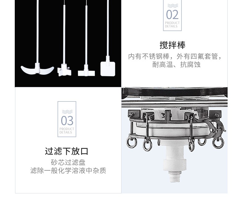 反應(yīng)釜過(guò)濾裝置采用PTFE材料制成,通過(guò)法蘭與釜體相連,方便拆卸清洗更換。固相反應(yīng)釜可用于攪拌、過(guò)濾、抽濾等工藝, 比常規(guī)的雙層玻璃反應(yīng)釜多一個(gè)可更換的濾板(可選濾布和濾網(wǎng)),過(guò)濾采用真空負(fù)壓進(jìn)行抽濾,高硼硅玻璃釜體,透明度高,能夠方便的觀察實(shí)驗(yàn)過(guò)程,也可以選配攪拌系統(tǒng)。